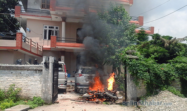 आन्दोलनकारीले कांग्रेस नेता खड्का घरमा राखिएको दुई वटा कार, तीन वटा मोटरसाइकल, दुई वटा बस र प्रहरी प्रमुखको भ्यानमा तोडफोड गर्नुका साथै आगजनी गरेका थिए ।